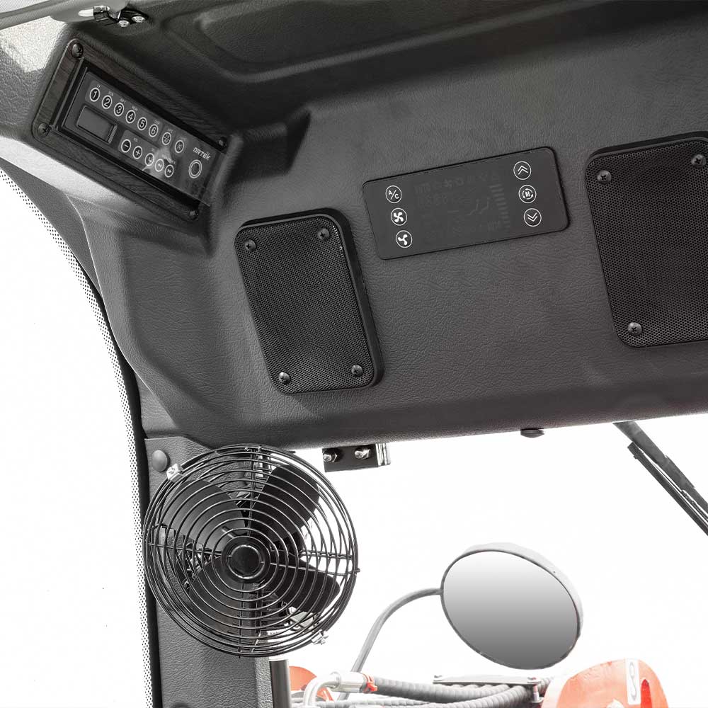 - Ergonomic cab with optional air conditioning, radio, and USB charging